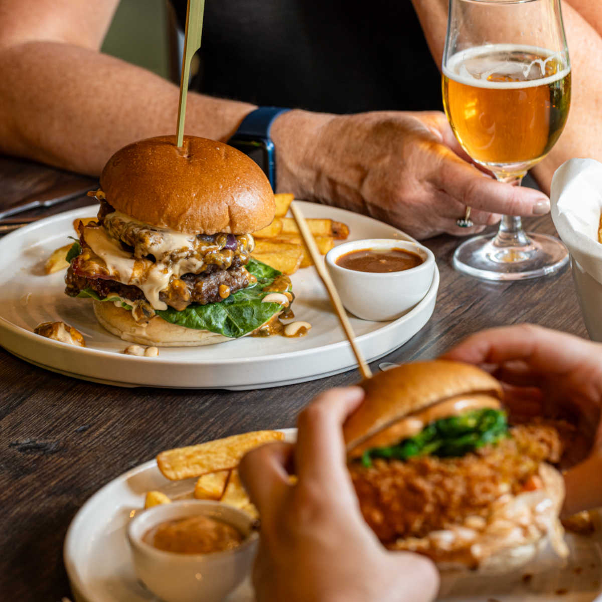 Blacksticks blue cheese, double beef burger, bacon, caramelised red onion, peppercorn mayo, skin-on chips | 19.5 1992 kcals
