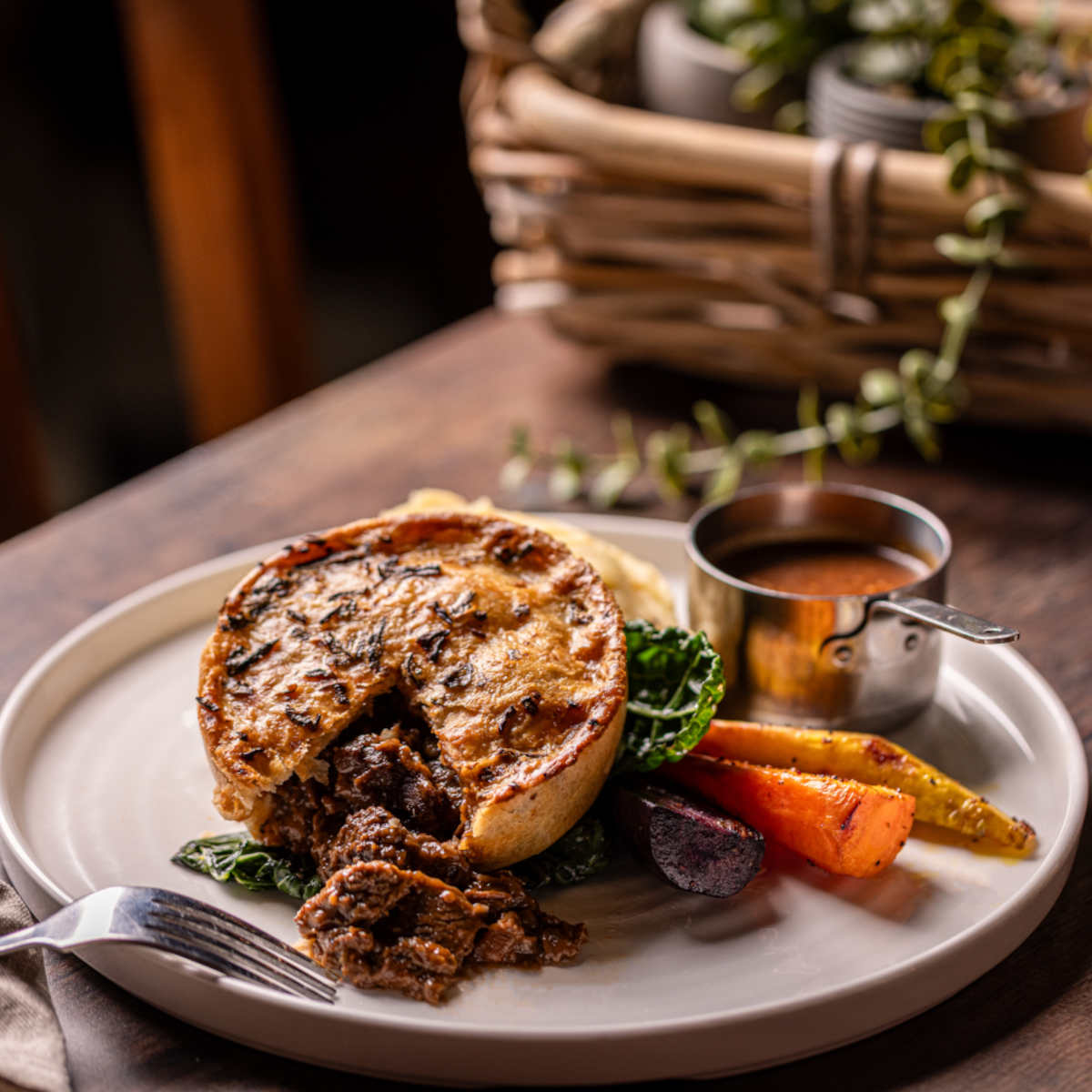 British steak & ale pie, mash, roasted roots, buttered cavolo nero | 18 1107 kcals