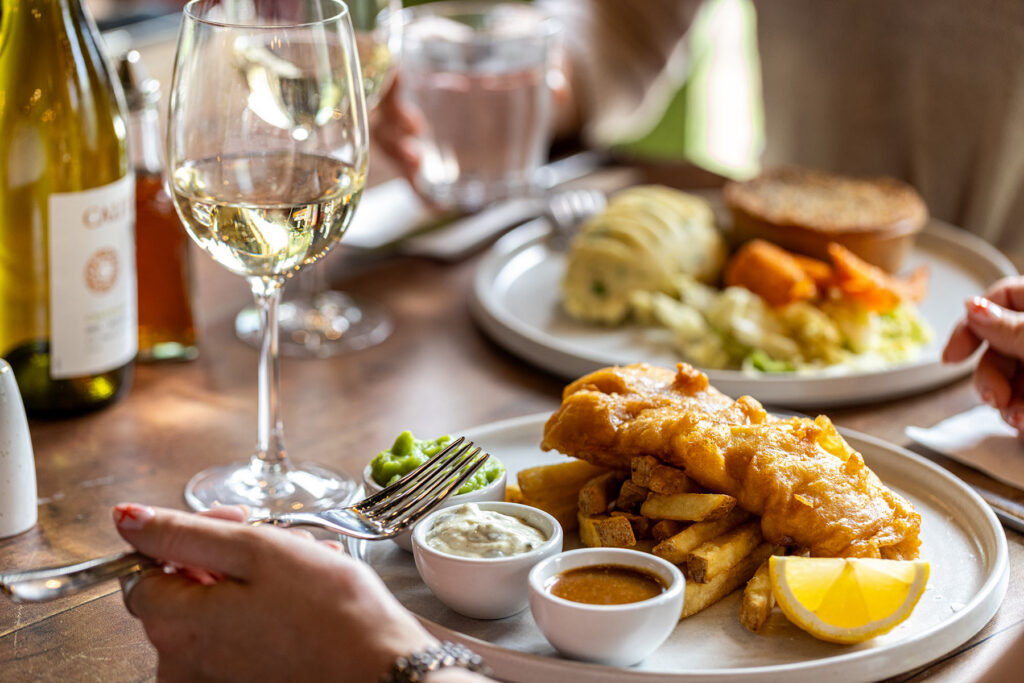 Beer-battered fish & chips, minted mushy peas, homemade tartare, curry sauce | 19 1657 kcals