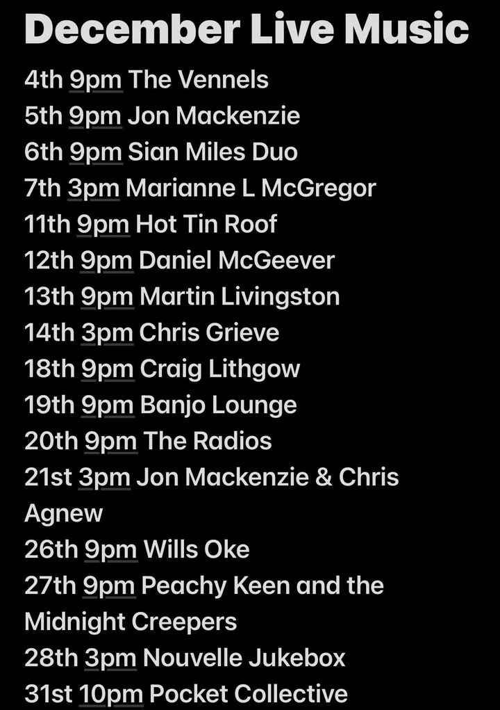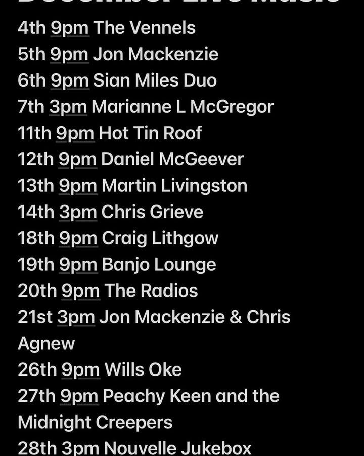This week is the start of our festive live music line up, and we’ve added a Thursday night to make you even more entertained. If you’ve not sorted your Christmas night out yet then, The Barony Bar has a festive menu to book online, or you can just enjoy our regular menu running 12-9pm. Thursday night 9pm it’s The Vennels, Friday night 9pm it’s Jon Mackenzie, Saturday night 9pm it’s Sian Miles Duo and then it’s Jazz on Sunday afternoon 3pm with Marianne McGregor. 😉